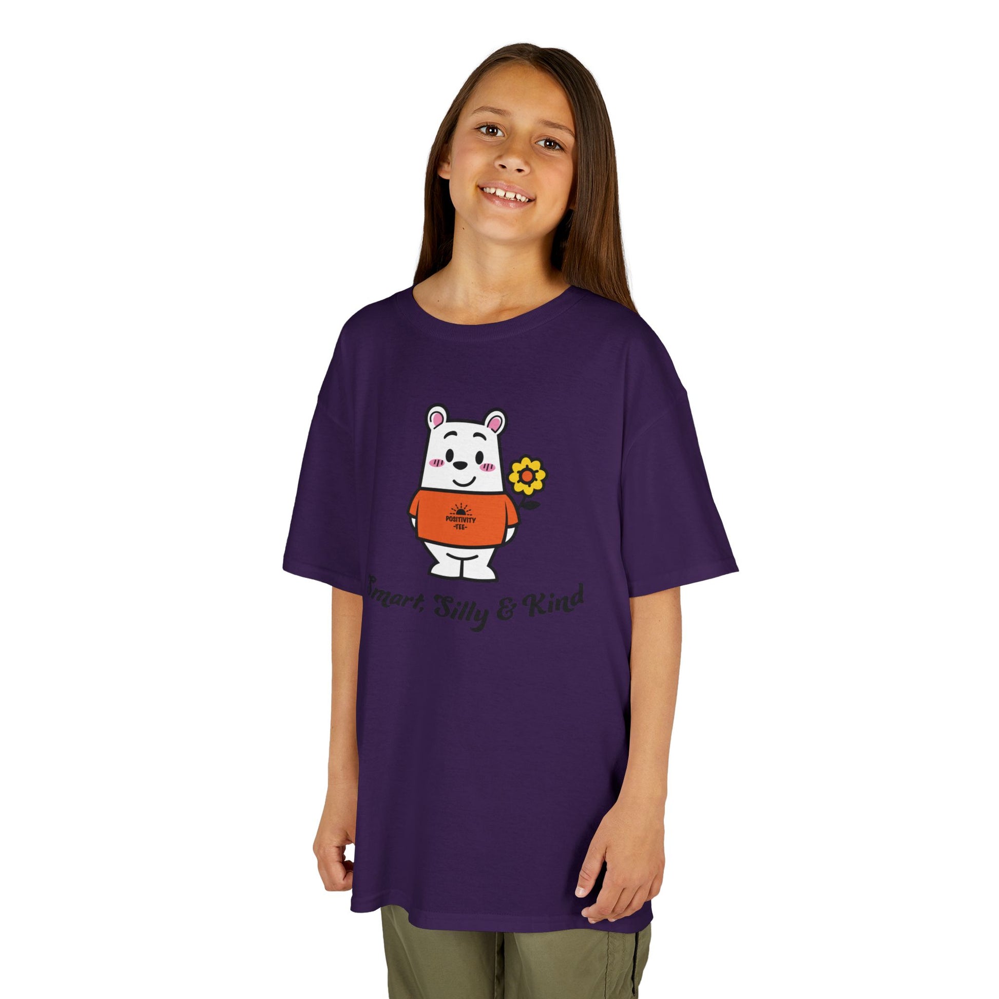 Introducing a delightful Kids Heavy Cotton™ Tee designed to bring smiles and comfort to your little ones. This tee features a cheerful bear graphic alongside the uplifting words "Smart, Silly & Kind," creating a playful vibe perfect for everyday adventures. Made from soft, ethically sourced cotton, it feels gentle against the skin, making it an ideal choice for all-day wear. Whether your child is playing at the park, attending a birthday party, or celebrating casual family gatherings, this tee will fit seamlessly into their wardrobe. Perfect for gifting during holidays like birthdays, back-to-school, or just because days, this shirt is sure to be a favorite among kids and parents alike!